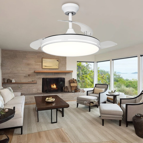 Simple Modern Design White LED Ceiling Fan Light Remote Control Retractable Invisible 42 Inch Low Profile